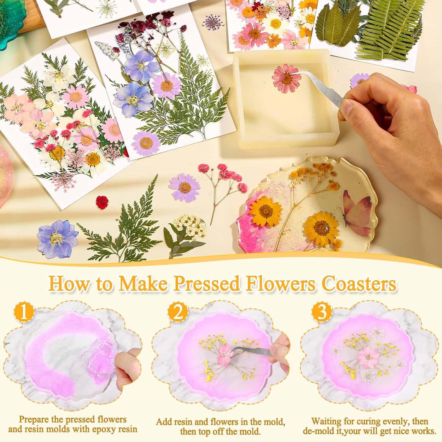 124 Pcs Dried Pressed Flowers for Resin Crafts, Real Pressed Wildflowers Natural Dry Leaves Bulk with Tweezer for Epoxy Resin Jewelry Molds, Candle Soap Making, Scrapbook, Bookmark, Nails Decor