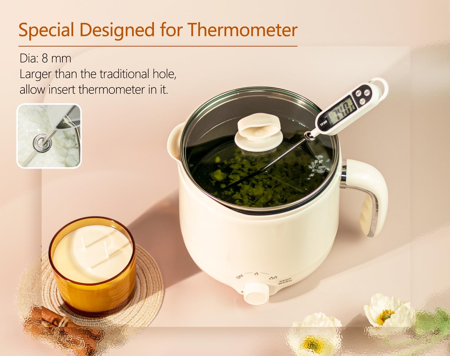 Clear temptress glass with thermometer probe hole. Dia: 8mm. Large than tranditional holes, allow the thermometer into the melted wax.