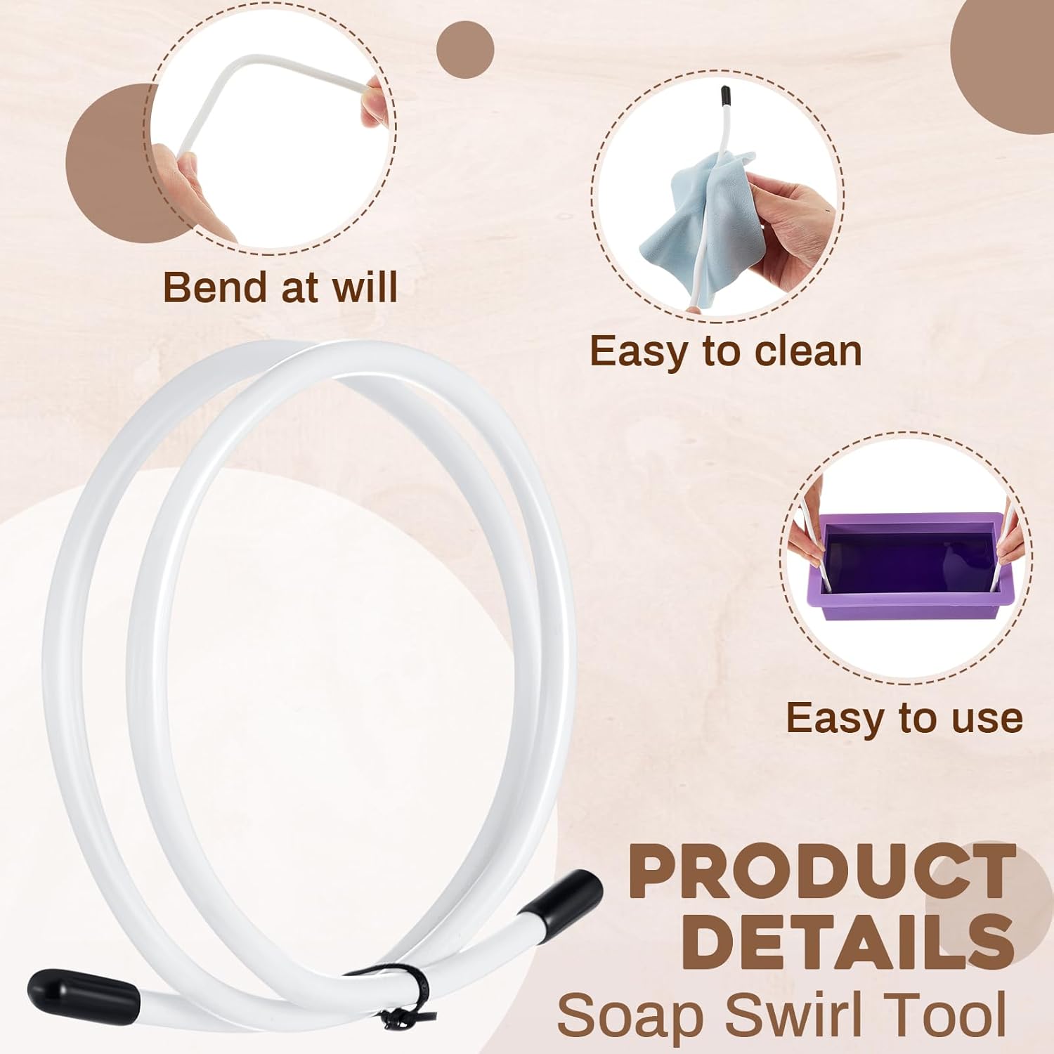 One outstanding feature of our soap swirl tool is the bendable and durable materials. The interiors are crafted from resilient metal wire and are clad in a plastic white outer skin for a sleek, modern look. For added protection and a comfortable grip, both ends are fitted with silicone sleeves.
